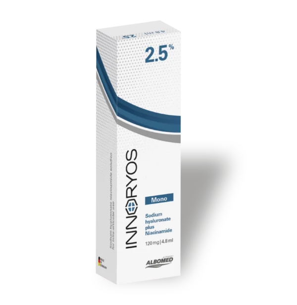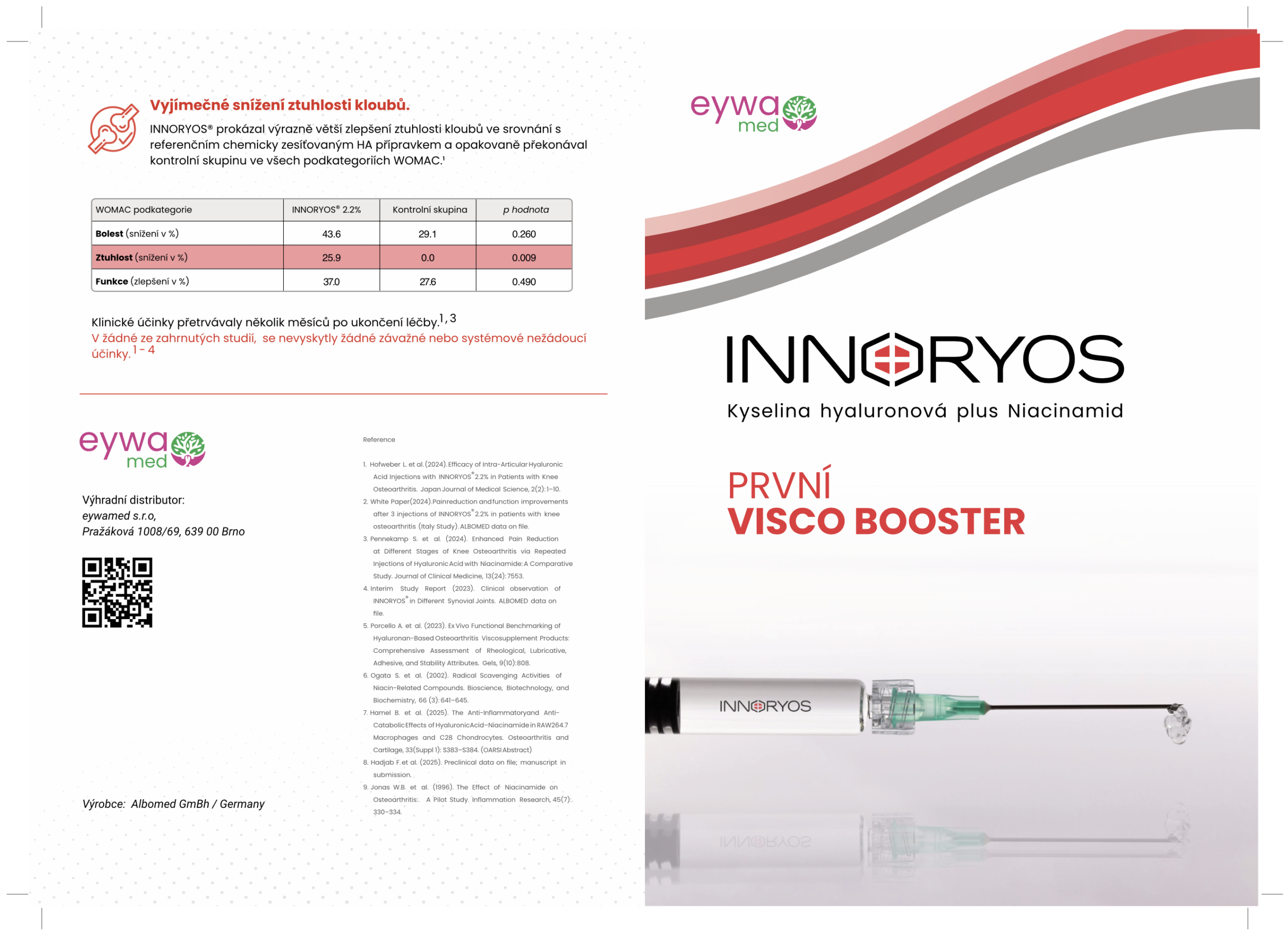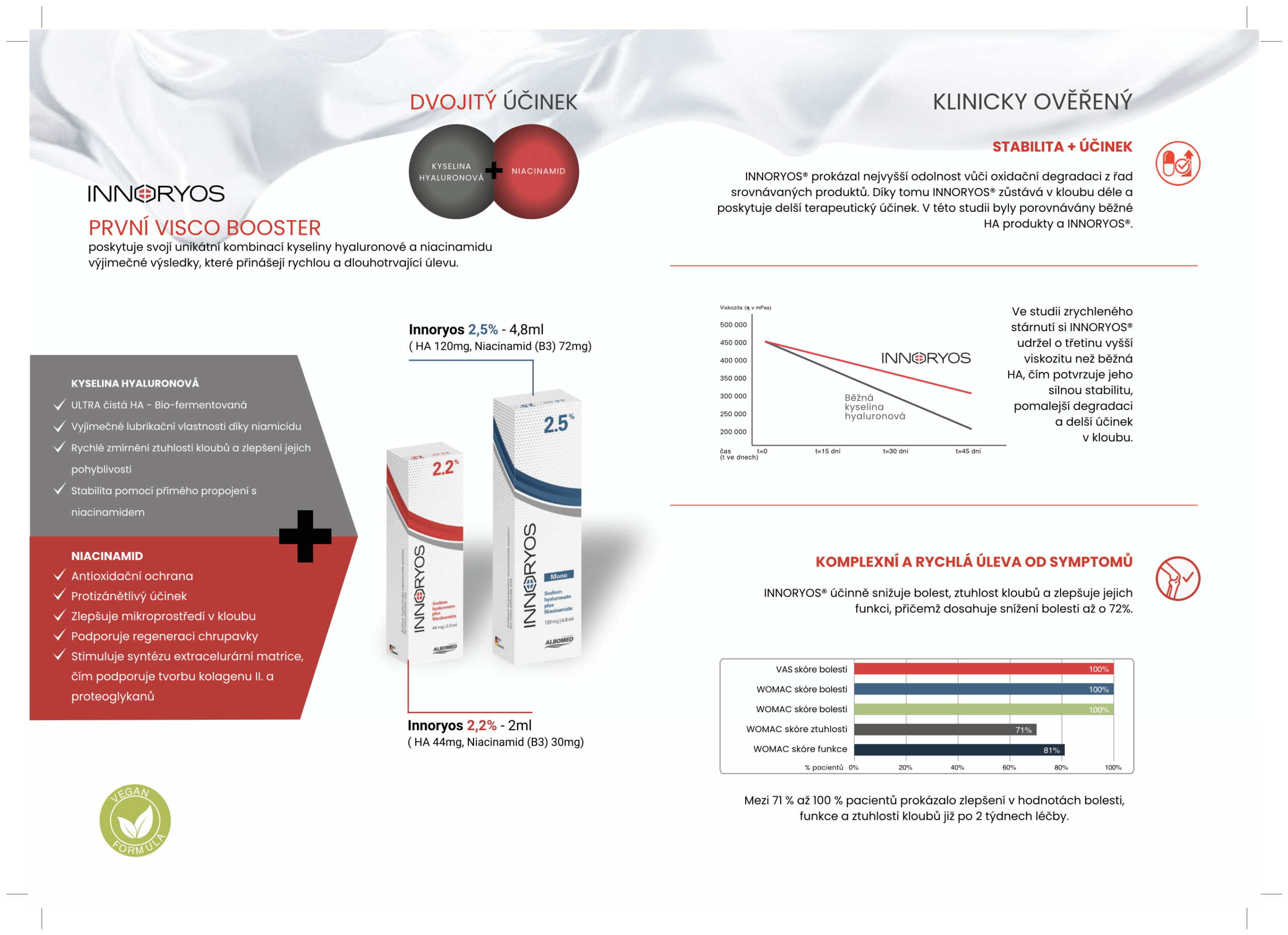 INNORYOS je moderní visco booster určený pro intraartikulární aplikaci. Kombinuje účinky kyseliny hyaluronové a niacinamidu (vitaminu B3) a představuje nový přístup k léčbě bolesti, ztuhlosti a omezené funkce kloubů.